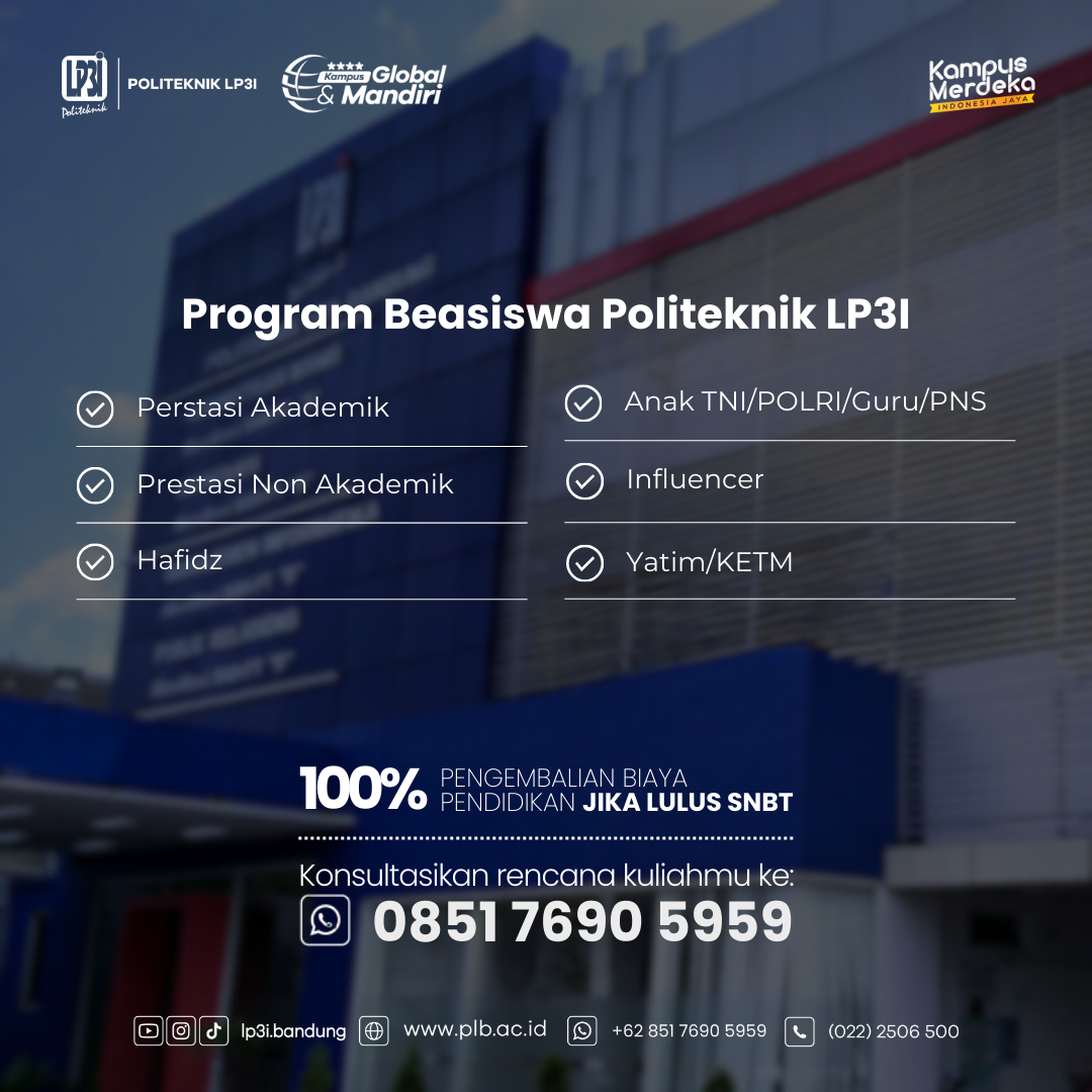 Politeknik LP3I mendukung Pemerintah untuk meningkatkan Angka Partisipasi Kasar (APK) yang melanjutkan ke jenjang pendidikan tinggi melalui Program Beasiswa. Besaran nilai Beasiswa 20%-100% tergantung dari hasil seleksi.